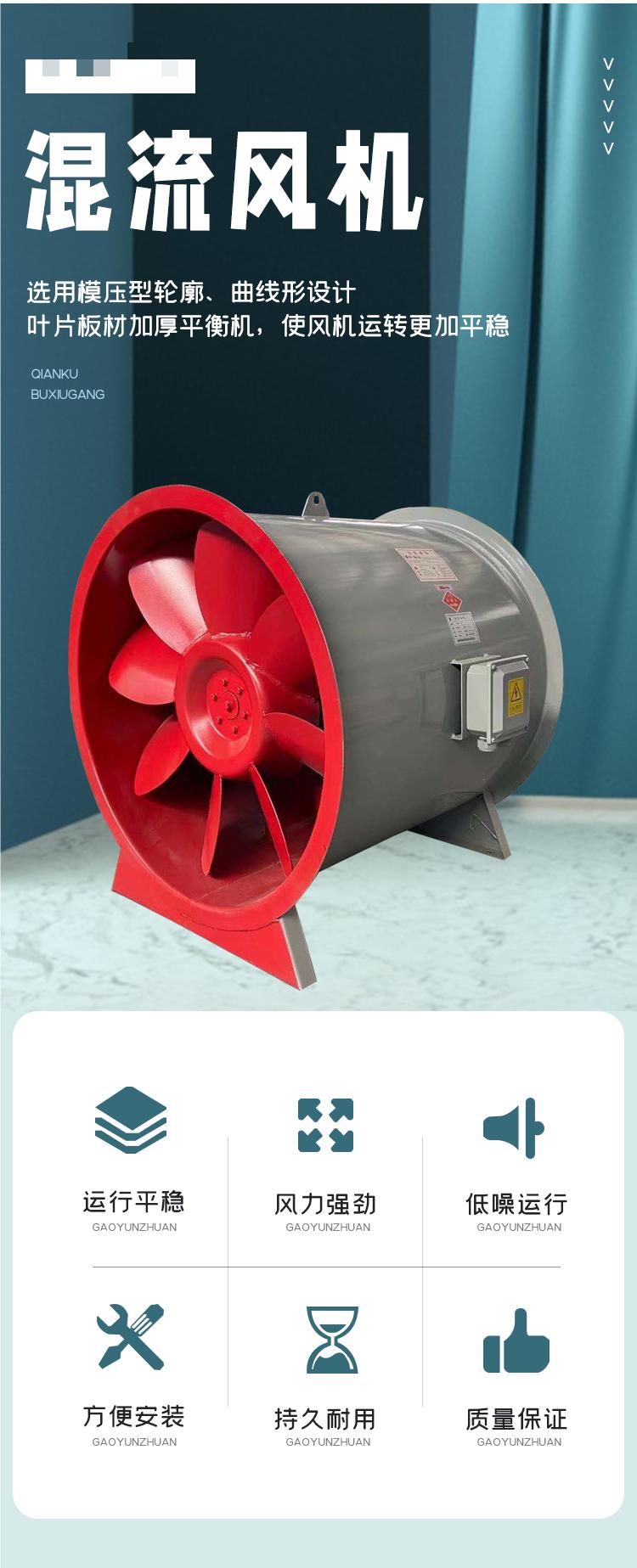 軸流風(fēng)機(jī)和離心風(fēng)機(jī)之間的風(fēng)機(jī),混流風(fēng)機(jī)的葉輪讓空氣既做離心運(yùn)動(dòng)又做軸向運(yùn)動(dòng),殼內(nèi)空氣的運(yùn)動(dòng)混合了軸流與離心兩種運(yùn)動(dòng)形式,所以叫“混流”。